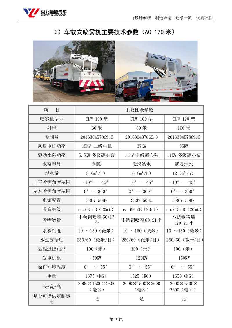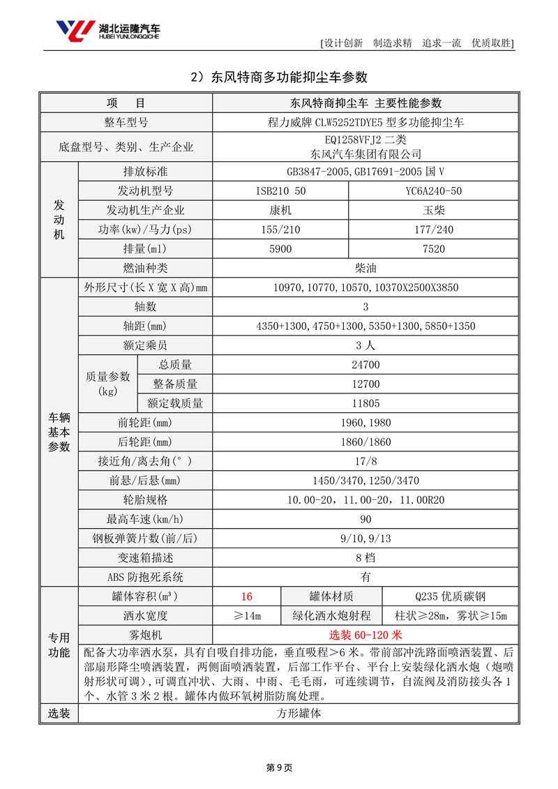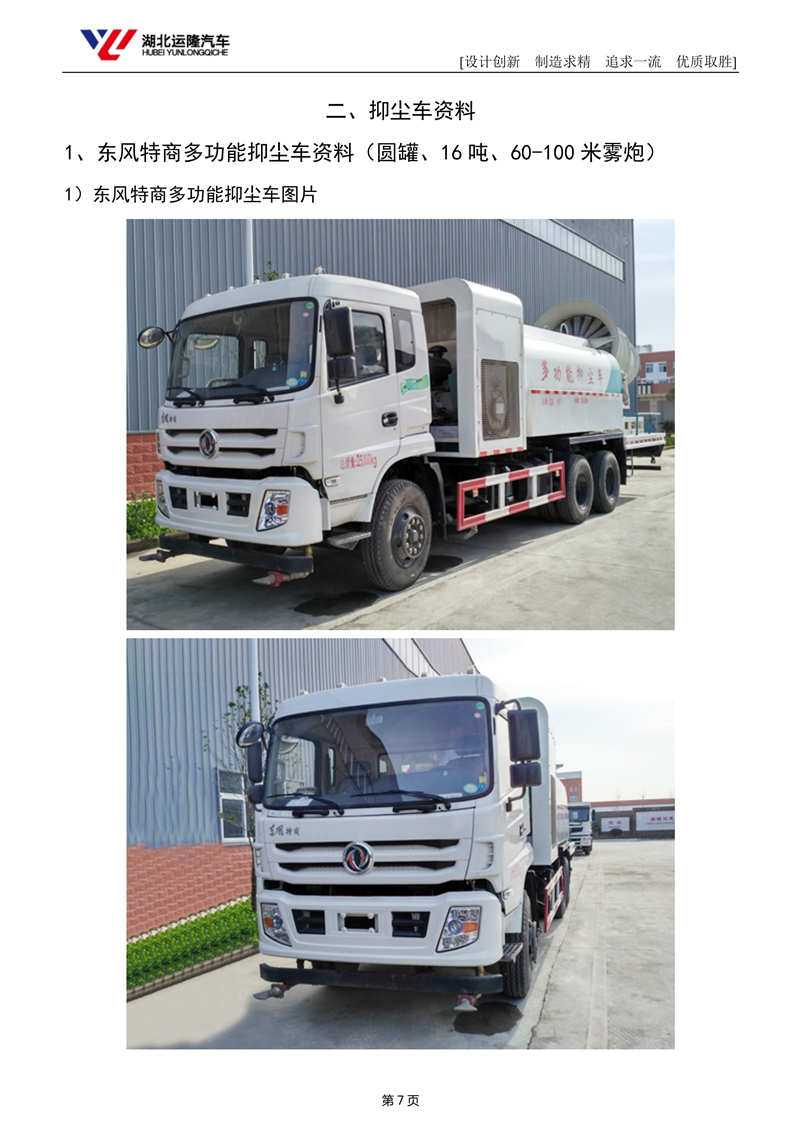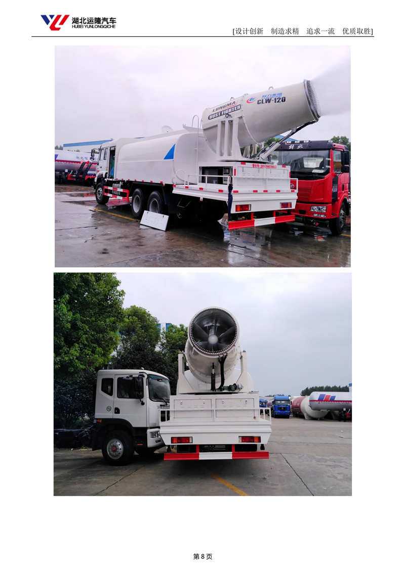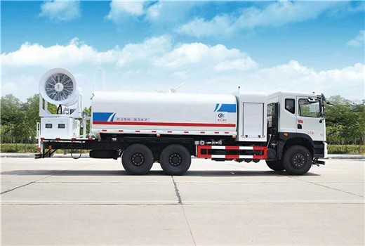 上裝配置:罐體容積為 15-18 立方多功能抑塵灑水車,選配風送式霧炮機組射程50米、60米、80米、100米、120米,罐體鋼板為4mm碳鋼Q235材質,罐內隔板具有防波作用,以減輕汽車行駛時罐體液體沖擊,罐體及整車外形尺寸按照公告。帶大功率專用灑水泵,泵可自吸自排,整車前沖、后灑、側噴、帶65消防接口,后平臺配CLW-50、CLW-60、CLW-80、CLW-100、CLW-120型風送式霧炮機組;罐體前封頭配大功率柴油發(fā)電機組;遠程遙控系統控制;霧炮機自動旋轉角度0-360°后平臺帶綠化灑水炮,灑水炮可全方位旋轉,可連續(xù)調成直沖狀、大雨、小雨、毛毛雨;前封頭帶水位計,后平臺主管路帶1寸澆花接口,后爬梯。帶兩根輸水管及陰陽端。罐體顏色:銀/灰/綠,罐體兩側噴“多功能抑塵車”字樣,貼反光標示。